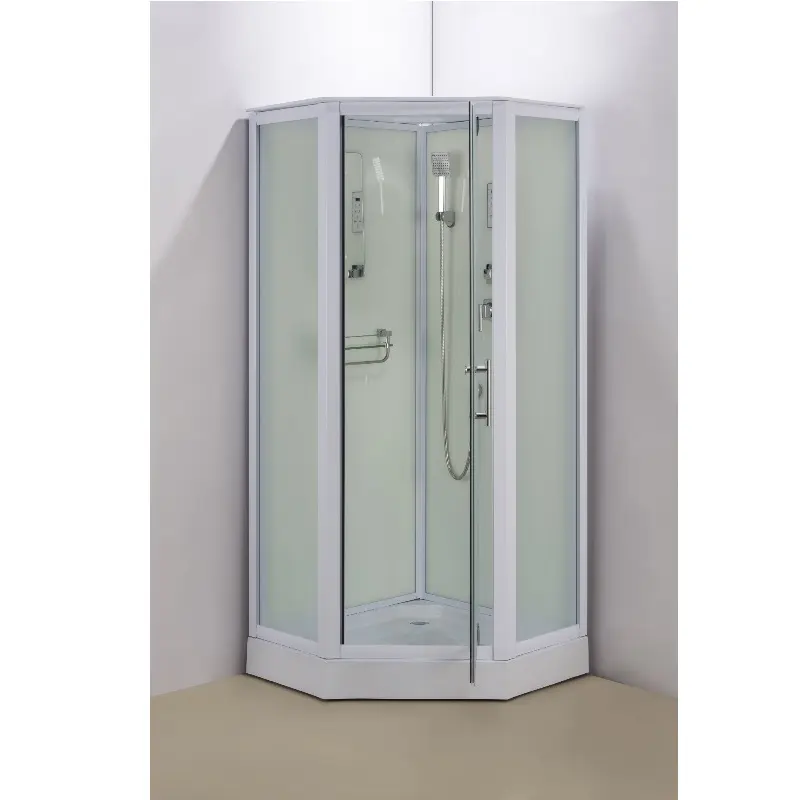 Душевая кабина Водный мир имеет размер 100х100 см. Форма — пятиугольная , цвет белый, исполнение полотна двери матовое. Механизм открывания распашной.